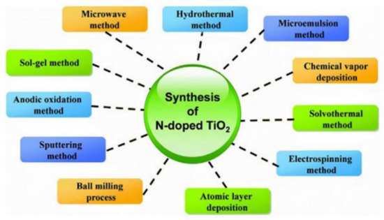 Different methods that are suitable to prepare nitrogen-doped TiO2. Reprinted with permission from Elsevier, 19 December 2021 Ref. [84].