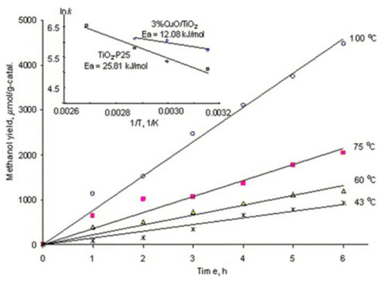 - Kočí, K.; Obalová, L.; Matějová, L.; Plachá, D.; Lacný, Z.; Jirkovský, J.; Šolcová, O. Effect of TiO2 particle size on the photocatalytic reduction of CO2. Appl. Catal. B Environ. 2009, 89, 494–502. [Google Scholar] [CrossRef]