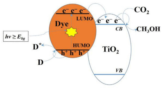 - Litter, M.I.; Román, E.S.; Grela, T.L.M.A.; Meichtry, J.M.; Rodríguez, H.B. Sensitization of TiO2 by dyes: A way to extend the range of photocatalytic activity of TiO2 to the visible region. In Visible Light-Active Photocatalysis: Nanostructured Catalyst Design, Mechanism and Applications; Wiley VCH: Weinheim, Germany, 2018; pp. 253–282. [Google Scholar]