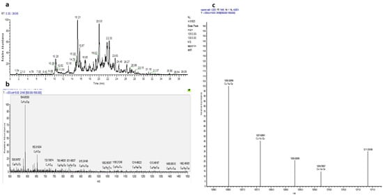 LC-MS-TOF analysis of the green tea seed extracted saponin. (a). LC-MS chromatogram of various saponins extracted from green tea seeds via HPLC (b) and the purified fraction containing the pure, isolated theasaponin E1 (c) The base peak intensity mass spectrum of green tea seed extracted saponins.