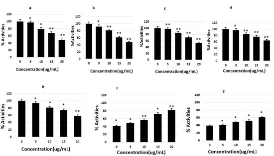 In vitro activities of various kinases and phosphatases involved in tau phosphorylation and dephosphorylation under the effects of theasaponin E1, quantified by ELISA. Percent activity for each enzyme was measured. (a) Changes in GSK3beta activity before and after treatment with saponins. (b) Changes of CDK5 activity by theasaponin E1. (c) Effect of theasaponin E1 on CAMII activity. (d) Effect of theasaponin E1 on JNK activity. (e) Effects of theasaponin E1 on ERK activities. (f) Effects of theasaponin E1 on PP1 activities. (g) Effects of theasaponin E1 on PP2B activities. Data are the values of mean ± SEM and were analyzed using one-way ANOVA (n = 3) (* p < 0.05; ** p < 0.01).