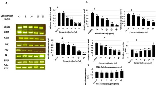 mRNA expression levels of various kinases and phosphatases involved in tau phosphorylation and dephosphorylation, determined by RT-PCR. (A). PCR products of mRNA expression of various genes of the kinases and phosphatases presented in gel band form after gel electrophoresis. (B). Relative mRNA expression levels of genes of various kinases and phosphatases after treatment with theasaponin E1. (a) Relative mRNA expression levels of GSK3 beta. (b) Relative mRNA expression levels of CDK5. (c) Relative mRNA expression levels of JNK. (d) Relative mRNA expression levels of ERK. (e) Relative mRNA expression levels of CAMII. (f) Relative mRNA expression levels of PP1. (g) Relative mRNA expression levels of PP2A. mRNA expression levels of genes of various kinases and phosphatases that were visualized as PCR products on agarose gel. Data are the mean values ± SEM and were analyzed using one-way ANOVA (n = 3). Data are statistically significant at p < 0.05 (* p < 0.05; ** p < 0.01 to the control group).
