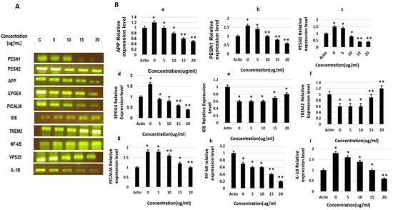 The results revealed significant effects of saponin treatment on the inhibition of several AD-promoting genes and activation of AD-alleviating genes. The expression levels of the major genes involved in tau and Aβ generation and AD pathogenesis (i.e., APP, PESN1, PESN1, EPOE4, and PICALM) were significantly suppressed in a dose-dependent manner. Saponin treatment also enhanced the activation and expression of TREM2 and IDE in a dose-dependent manner and affected the expression of inflammatory genes and cytokines involved in AD worsening (i.e., NF-kB and IL-1B). The relative expression levels of all genes were normalized to those of the control (β-actin) and calculated (Figure 5).