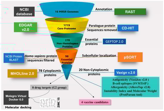 This study was carried out to identify the putative drug targets and vaccine candidates against MRSA strains for proposing alternative prospective therapeutics. Earlier, the development of new antimicrobial agents and vaccine therapies was limited due to a computational technology bottleneck. However, in this post-genomic era, advances in the fields of genomics, proteomics, coupled with the development of bioinformatics tools have allowed for in silico identification of new drug candidates and vaccine targets from genomics, and protein sequence resources using the subtractive genomic approach or reverse vaccinology approach [28]. The reverse vaccinology approach is a powerful method for the identification of unique yet uncharacterized sequences as possible therapeutic targets [29,30,31]. Reverse vaccinology reduces the time needed to develop new vaccines and offers flexibility even for non-cultivable pathogens [32]. This approach also allows not only the detection of all the antigens as observed through the conventional methods but also the discovery of novel antigens that function on a different paradigm [18].