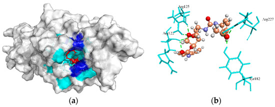 The molecular docking analysis of Pta (WP_000774281.1) with compound ZINC4270981. (a) 3D surface representation of ZINC4270981 (red) and Pta interactions with hydrogen bonding sites (blue), and hydrophobic interactions (cyan). (b) Residues (cyan) involved in the H-bond interaction (green dashed lines) with the compound (scaled ball and stick).