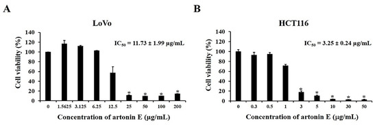 Effect of artonin E on cell viability following treatment with different concentrations of artonin E for 24 h: (A) LoVo cells and (B) HCT116 cells. The data are presented as mean ± SD (n = 3). * p < 0.05 compared with the control group.