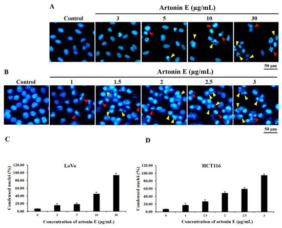 Chromatin condensation and apoptotic bodies in LoVo and HCT116 cells. (A) LoVo cells and (B) HCT116 cells were treated with various concentrations of artonin E for 24 h; then, chromatin condensation and apoptotic bodies were observed by Hoechst 33342 staining. Red and yellow arrows indicate chromatin condensation and apoptotic bodies, respectively, compared with the control group. Quantification of % nuclear condensation was determined by Hoechst 33342 staining in (C) LoVo cells and (D) HCT116 cells. * p < 0.05 compared with the control group.