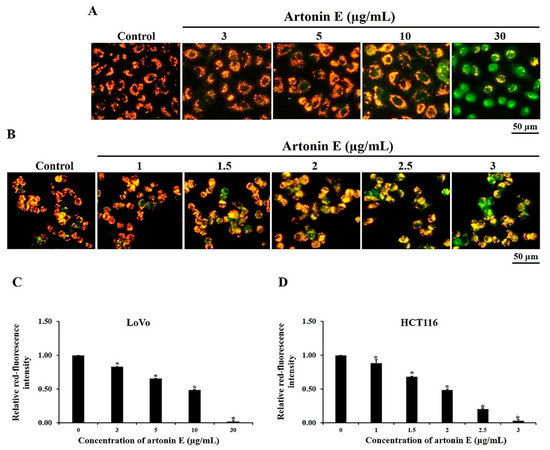 Effect of artonin E on ΔΨm in LoVo and HCT116 cells. (A) LoVo and (B) HCT116 cells were treated with different concentrations of artonin E for 6 h. Artonin E decreased red fluorescence and increased green fluorescence in both (C) LoVo and (D) HCT116 cells, compared with the control cells. * p < 0.05 compared with the control group.