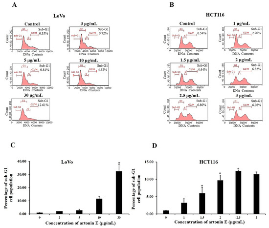 To confirm the effect of artonin E on apoptosis induction, LoVo and HCT116 cells were stained with PI, and the DNA contents were measured by flow cytometry. LoVo and HCT116 cells treated with 30 µg/mL and 2.5 µg/mL artonin E, respectively, showed a maximum sub-G1 population of 12.61% and 6.80% (Figure 4). In this study, the results revealed that artonin E induced apoptosis in LoVo and HCT116 cells through the accumulation of the sub-G1 population.