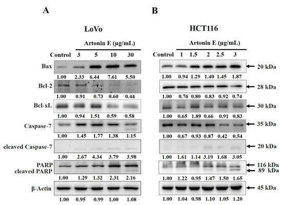 Effect of artonin E on apoptosis protein expression. Cells were treated with different concentrations of artonin E for 24 h. Expression of the Bcl-2 family, caspase-7, and cleaved-PARP in (A) LoVo cells and (B) HCT116 cells (p < 0.05).