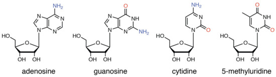 Chemical structures of the nucleosides employed in this study. Hydrogen-bond donors and acceptors are shown in blue and red color.
