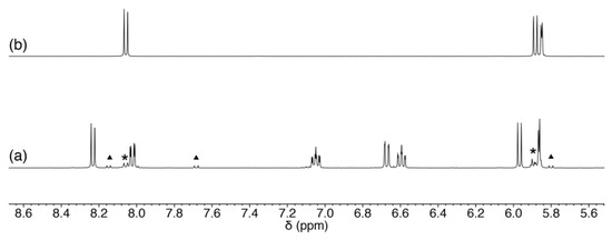 In the case of 5-methyluridine, on the other hand, no shift was observed for the resonances of both the nucleoside and [Pd(Amp)Cl]−, indicating that 5-methyluridine was not able to coordinate to the Pd center (Figure 8). In the presence of 1 equiv. of triethylamine, a few sets of resonances corresponding to 5-methyluridine, including unreacted, were observed. From the integration ratio, over 80% of 5-methyluridine remained unreacted, although the formation of a minor amount of [Pd(Amp)(5-methyluridine)]-adduct was observed. The resonances corresponding to [Pd(Amp)]-fragment became sharp and the formation of a new species [Pd(Amp)(OCD3)]− was suggested. These results showed that two hydrogen-bond acceptors in 5-methyluridine distract its coordination to the [Pd(Amp)]-fragment due to the electrostatic repulsive force between O atoms of Amp− ligand and 5-methyluridine. Thus, [Pd(Amp)]-fragment exhibited high selectivity on the coordination of pyrimidine-nucleosides, owing to the preference of hydrogen-bonding interactions between Amp− and the pyrimidine moieties.