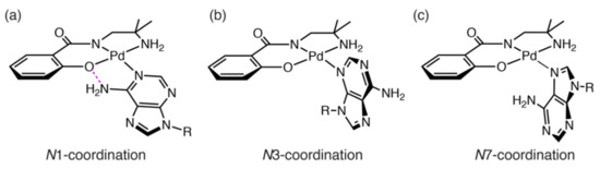 Two purine-nucleosides, adenosine and guanosine, were evaluated as well as the pyrimidine-nucleosides. Due to the increasing possible coordination sites (N1-, N3-, and N7-position), purine-nucleosides might afford different products compared with the previous cases. Adenosine possesses a hydrogen-bond donor at 6-position and no hydrogen-bond acceptor exists at the coordination site. For [Pd(Amp)(adenosine)]-adduct (Pd-A), three different coordination modes are possible depending on which N atom is coordinated (Figure 9). The 1H NMR spectrum indicated that the product is a mixture of Pd-A (Figure 10). The resonances according to the protons at adenine moiety imply that three species (Pd-A1, Pd-A2, and Pd-A3) are present in the reaction solution. The formation ratio of the products was determined to be Pd-A1:Pd-A2:Pd-A3 = 6:3:2 from the integration of the resonances of the aryl-H of the adenine moiety. The N1-coordination mode is favorable because it is supported by a hydrogen bond (Figure 9a). Such intramolecular hydrogen-bond formation with adenine was reported in a PdII complex with coordination at the N9 position of adenine, although the N9 position is not available for coordination in our current system [19]. In contrast, no intramolecular hydrogen-bond interactions are expected for the other two modes (Figure 9b,c). Moreover, the N3 coordination must endure a large degree of steric hindrance between the ligand and ribose moiety. Thus, the major product Pd-A1 is in the N1-coordination mode, and the two other sets of signals Pd-A2 and Pd-A3 correspond to the N7- and N3-coordination modes, respectively.