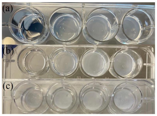 Macroscopic images of at the different stages of the synthetic process: (a) acidic mixture (pH 3.6) left at 37 °C overnight, (b) after washing with citrate solution (pH 7.2) to neutral pH and (c) after incubation with thrombin in citrate at 37 °C overnight. Final concentrations: fibrinogen = 20 mg.mL−1, collagen (from left to right) = 0, 2.5, 5, 10 mg.mL−1.