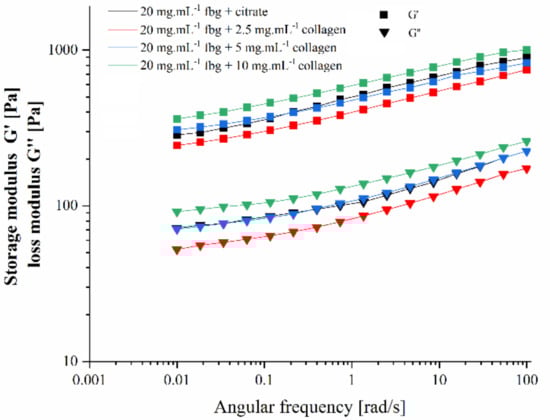Rheological properties of hydrogels were measured using frequency sweep from 0.01 to 100 rad.s−1 with 1% amplitude. All gels exhibited an increase in storage modulus with increasing frequency (Figure 2). In the presence of thrombin, the addition of 2.5 mg.mL−1 collagen decreased the storage modulus G′ compared to pure fibrin. There was no obvious difference between pure fibrin and after 5 mg.mL−1 collagen addition, while 10 mg.mL−1 collagen slightly increased the G′ value compared to pure fibrin. The loss modulus G″ showed similar evolution as G′.