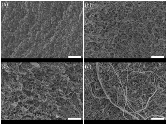 SEM images of the fibrin and fibrin-collagen hydrogels: (a) pure fibrin at 20 mg.mL−1; (b) fibrin 20 mg.mL−1:collagen 2.5 mg.mL−1; (c) fibrin 20 mg.mL−1:collagen 5 mg.mL−1; (d) fibrinogen 20 mg.mL−1:collagen 10 mg.mL−1. (scale bar = 2 μm).