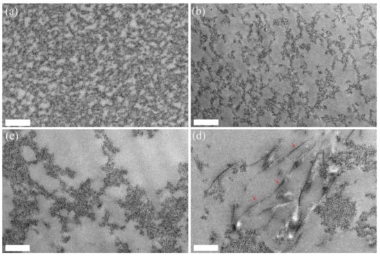 TEM images of the fibrin and fibrin-collagen hydrogels: (a) pure fibrin at 20 mg.mL−1; (b) fibrin 20 mg.mL−1:collagen 2.5 mg.mL−1; (c) fibrin 20 mg.mL−1:collagen 5 mg.mL−1; (d) fibrinogen 20 mg.mL−1:collagen 10 mg.mL−1. (Scale bar = 500 nm). Red arrows indicate collagen fibrils.