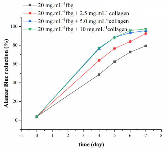 The first evaluation of the impact of collagen on the ability of fibrin gels to act as a 2D substrate for muscular cell development was performed. C2C12 myoblast cells were seeded on fibrin and fibrin-collagen gels, and their proliferation was followed by an Alamar Blue test. Cells grew rapidly in the first four days on all hydrogels, but proliferation was the highest for fibrin-collagen gels containing 5 and 10 mg.mL−1 collagen and the lowest in the absence of collagen, with an intermediate value for 2.5 mg.mL−1 collagen (Figure 5). For the two first samples, a plateau was reached on the sixth day as all the Alamar Blue reagent had been reduced. For the two other samples, growth continued over 1 week but was always greater on gels containing 2.5 mg.mL−1 collagen than on pure fibrin gels.