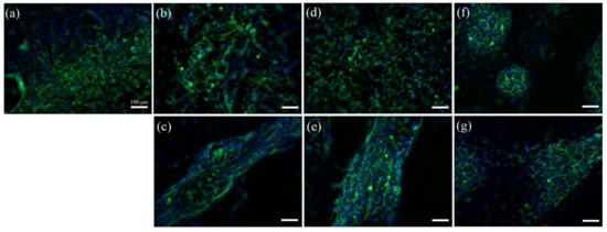 Fluorescence images of C2C12 cells cultured for 6 days in serum-rich medium on (a) 20 mg.mL−1 fibrin; (b,c) 20 mg.mL−1 fibrin with 2.5 mg.mL−1 collagen (d,e) 20 mg.mL−1 fibrin and 5 mg.mL−1 collagen; (f,g) 20 mg.mL−1 fibrin with 10 mg.mL−1 collagen. (Blue: DAPI, green: Alexa Fluor 488 Phalloidin). (Scale bar = 100 μm).