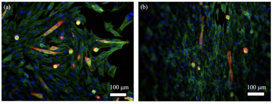 Fluorescence images of C2C12 cells cultured for 4 days in serum-rich and 7 days in low-serum DMEM on (a) 20 mg.mL−1 fibrin; (b) 20 mg.mL−1 fibrin with 10 mg.mL−1 collagen (Blue: DAPI, green: Alexa Fluor 488 Phalloidin, red: MF20- Alexa Fluor 546).