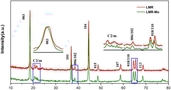 Figure 1 shows the XRD patterns of LMR (denotes Li1.2Mn0.54Ni0.13Co0.13O2) and LMR-Mo (denotes Mo-surface-modified Li1.2Mn0.54Ni0.13Co0.13O2). For the sample LMR, all of the dominant diffraction peaks and apparent splitting peaks of 006/102 and 018/110 of both materials can be indexed to the R-3m space group of the hexagonal α-NaFeO2-type layered structure, without an obvious impurity phase [35,36]. The weak superstructure reflections of both materials between 20° and 25° indicate the existence of the Li2MnO3 phase, which is the typical feature of lithium-rich cathode materials, arising from the superlattice ordering of Li and Mn in the transition metal layers of the Li2MnO3 phase [37,38,39,40].