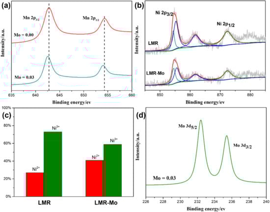 To investigate the changes in chemical states brought about by Mo modification, XPS analysis was conducted in this work. Figure 3 shows the spectra of Mn, Ni, and Mo in LMR and LMR-Mo. For the LMR sample, the binding energies of Mn 2p3/2 and Mn 2p1/2 were 642.5 eV and 654 eV, corresponding to the Mn4+ of MnO2 [46,47]. In comparison, the binding energies of Mn 2p3/2 and Mn 2p1/2 for the LMR-Mo sample were slightly down-shifted, indicating that the charge transfer to Mn from Mo occurred after surface modification with Mo. As shown in Figure 3b, all of the Ni 2p3/2 were divided into two peaks for Ni2+ and Ni3+; after Mo modification, the Ni2+ content increased from 27% for LMR to 41% for LMR-Mo. Evidently, Mo surface modification led to an increase in Ni2+ and a decrease in Ni3+, improving the Ni2+/Ni4+ ratio and thus boosting the cathode material’s specific capacity. Figure 3d shows the XPS spectrum of Mo. The binding energy of Mo 3d5/2 was around 232.5 eV, indicating that Mo existed in the material in the +6 oxidation state, implying that the coating layer may be composed of molybdenum oxide or molybdenate.