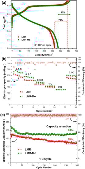 Figure 4a shows the initial charge/discharge profiles of batteries with LMR or LMR-Mo as cathodes, respectively. Generally, the charging process of lithium-rich manganese-based layered cathode materials can be divided into two stages [48,49,50,51]. In the first stage (potential < 4.45 V), the Li+ are released and charge compensation is achieved by transition metal ion oxidation in LiTMO2, specifically Ni2+/Ni4+ and Co3+/Co4+; the Li2MnO3 phase does not participate in the reaction and only plays the role of stabilizing the material’s structure. In the second stage, when the voltage is higher than 4.45 V, Li+ is released and charge compensation is achieved by the O2– in Li2MnO3; at the same time, Li2MnO3 turns into the MnO2 active component. Figure 4a shows that LMR and LMR-Mo had two similar charge/discharge curves and delivered respective discharge capacities of 261.2 and 280.9 mAh·g–1 at 0.1 C. Surface modification with Mo thus brought about a 10% increase in the discharge capacity. In fact, the maximum discharge specific capacity of LMR-Mo reached 290.5 mAh·g–1 after typical electrochemical activation. LMR-Mo also exhibited a better rate performance (Figure 4b) and better cyclability than LMR. After 300 cycles at 1 C, the capacity of the battery with the LMR-Mo cathode was 181.8 mAh·g–1, with the capacity retention being up to 82%, whereas the battery with the LMR cathode had a capacity of only 124.5 mAh·g–1, with approximately a 70% capacity retention (Figure 4c). The dQ/dV curves of LMR and LMR-Mo (Figure S2, Supplementary Materials) also illustrated that, even after 300 cycles, the LMR-Mo still had a higher cycle retention. All of the above results indicated that the surface modification with Mo significantly improved the electrochemical performance of LMR. We suggested that the formation of a Mo compound nanolayer on the surface of the material particles may have lessened the electrolyte’s corrosive effect on the active material, resulting in a better long cycling stability.