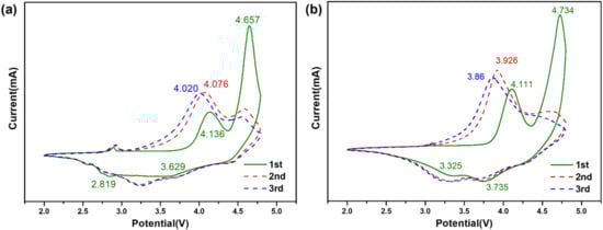 CV curves of initial three cycles in the potential range of 2.8–4.8 V for (a) LMR and (b) LMR-Mo.