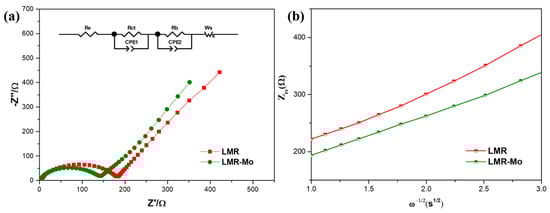(a) Nyquist plots of LMR and LMR-Mo. (b) Plots of Zre vs. ω–1/2.