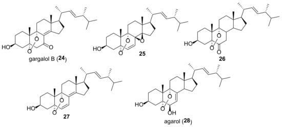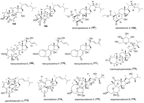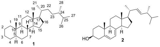 Fungi are a rich source of chemical compounds with a wide spectrum of biological activity [1]. To survive in the environment in which they exist, they need to protect themselves from fungal infections. Therefore, it is not surprising that antimicrobial or antiviral compounds beneficial to humans can be isolated from many fungi [2]. A large number of currently used drugs have their origins in fungi [3]. Steroids occupy an important place among fungal constituents. The vast majority of them are ergosterol metabolites. The latter is the main sterol of fungi involved in the regulation of membrane fluidity and structure as well as performing immunological functions [4]. Fungal ergosterol derivatives are often referred to as “ergostane-type steroids” [5,6,7,8,9,10,11,12] or “ergosteroids” [13,14,15,16,17]. One should bear in mind, however, that the application of the term “ergosteroids” can be confusing, as it was also suggested by Lardy et al. [18] to structurally different dehydroepiandrosterone derivatives based on their mode of action (influence on energy metabolism).