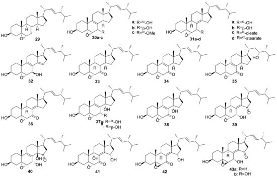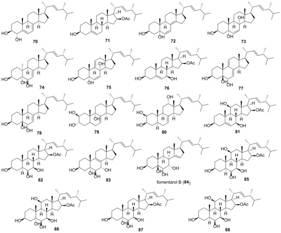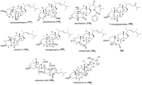 Sterol fraction of fungi is typically a mixture of sterols [75]. As a rule, ergosterol has been considered to be its dominant component. However, this is not true in all cases. There are at least four other taxon-specific sterols (cholesterol, 24-methylenecholesterol, 24-ethylcholesterol, and brassicasterol), which may be the main sterols in some fungal species [76]. Research on the biological or pharmaceutical uses of ergostane sterols has received much less attention compared to ergosterol or functionalized ergostanes. Only sterols that have attracted attention as objects for the further in-depth study will be considered here.