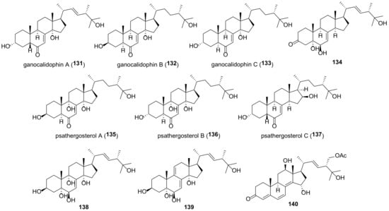 - Liu, Y.P.; Pu, C.J.; Wang, M.; He, J.; Li, Z.H.; Feng, T.; Xie, J.; Liu, J.K. Cytotoxic ergosterols from cultures of the basidiomycete Psathyrella candolleana. Fitoterapia 2019, 138, 104289. [Google Scholar] [CrossRef]