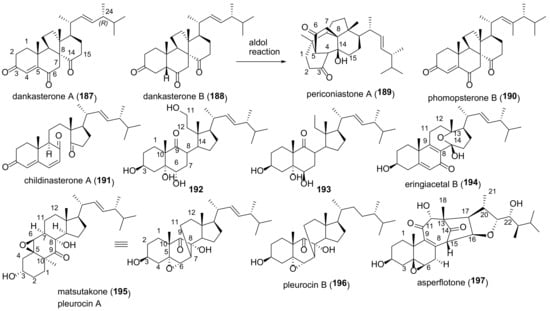 A number of hybrids of 9-dehydroergosterol with polyketides have been isolated from natural sources. Two anthraquinone derivatives, evantrasterol A and B (16 and 17) (Figure 4), have been found in the endophytic fungus Emericella variecolor [119].