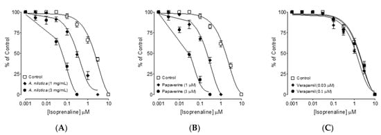 The relaxing effect of A. nilotica against high K+ and CCh at identical concentrations is an indication of PDE inhibition [40]; therefore, dose-mediated inhibitory curves of isoprenaline against CCh in the presence and absence of A. nilotica were used to indirectly validate PDE inhibition. PDE blockage was indicated by the potentiation of isoprenaline curves to the left, similar to papaverine, a typical PDE inhibitor, utilized as a control [41].
