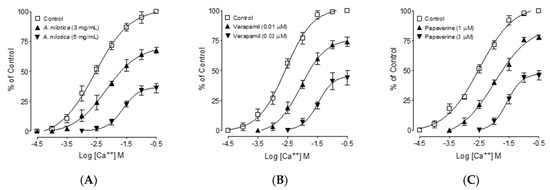 Concentration–response curves of Ca++ in the absence and presence of the increasing concentrations of the (A) methanolic extract of A. nilotica, (B) verapamil, and (C) papaverine in isolated rat ileum preparations. Values shown are the mean ± SEM, n = 4–5.