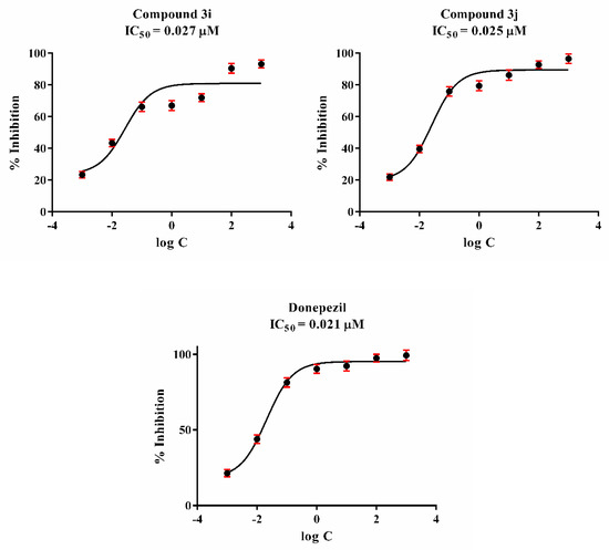 IC50 graphs of compounds 3i and 3j and donepezil on AChE enzyme (the graphs were formed using GraphPad Prism Version 6 via regression analyses).
