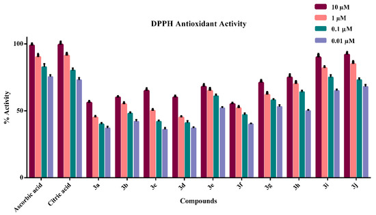 For the DPPH free radical scavenging activity test, test compounds were prepared at 10 µM, 1 µM, 0.1 µM, and 0.01 µM concentrations, as shown in Figure 3. By using the absorbance changes determined because of the spectroscopic measurement, the % DPPH free radical scavenging activities of the synthesized compounds and reference materials (ascorbic acid and citric acid) were determined. The % antioxidant activities of all tested compounds were calculated based on the control. Among the test compounds, all compounds at a concentration of 10 µM showed more than 50% antioxidant activity. Compounds 3i and 3j showed inhibition of 90.00% ± 2.40; 92.00% ± 1.80, respectively, at this concentration. They showed inhibition of 82.00% ± 1.20; 85.00% ± 2.00, respectively, at 1 µM concentration. Compounds 3i and 3j showed inhibition of 75.00% ± 1.80; 73.00% ± 1.40, respectively, at a concentration of 0.1 µM. They showed inhibition of 65.00% ± 1.10; 68.00% ± 1.50, respectively, at a concentration of 0.01 µM. Compounds 3i and 3j were observed to have a higher antioxidant activity compared to other obtained compounds. As a result of these findings, it was revealed that compounds 3i and 3j may have the potential effects on patients suffering from AD.