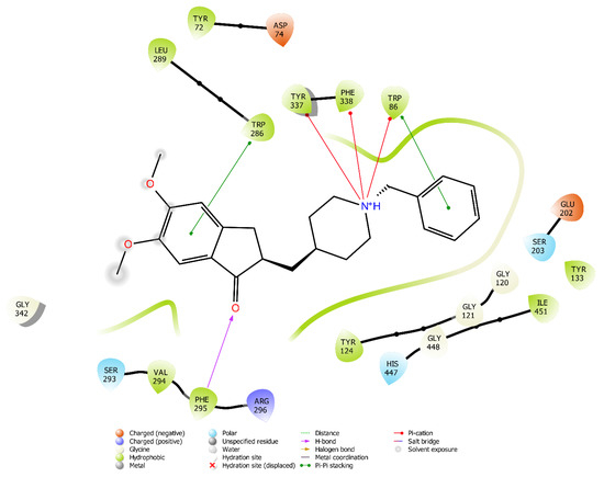 Figure 5 and Figure 6 show that the indanone ring of donepezil exhibited one π–π interaction with the indole ring of amino acid Trp286. The carbonyl group of the indanone formed a hydrogen bond with the amine group of Phe295, and this group formed an aromatic hydrogen bond with phenyl of Phe338. The nitrogen of piperidine ring exhibited three π–π interactions with the phenyl ring of Phe338, Tyr337, and the indole ring of Trp86. The phenyl ring of the benzyl group attached to the piperidine ring exhibited one π–π interaction and three aromatic hydrogen bonds. While the π–π interaction occurred with the indole ring of Trp86, the aromatic hydrogen bonds were formed between the carbonyl group of His447, the carbonyl group of Glu202, and the hydroxyl group of Glu202.