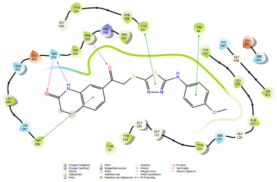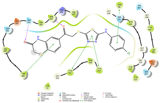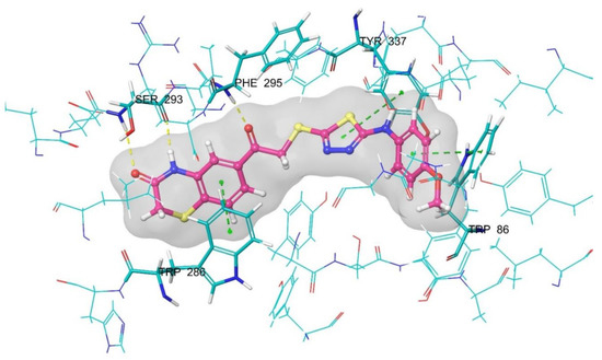 Figure 9 and Figure 10 show that the 2H-benzo[b][1,4]thiazin-3(4H)-one ring of compound 3j exhibited a π–π interaction with the indole ring of amino acid Trp286. The carbonyl group of 2H-benzo[b][1,4]thiazin-3(4H)-one ring formed a hydrogen bond with the amine group of Ser293. The carbonyl group of compound 3j formed a hydrogen bond with the amino group of Phe295, and this group formed an aromatic hydrogen bond with phenyl rings of Phe338. The thiadiazol ring of compound 3j formed two π–π interactions with phenyl rings of Tyr341 and Tyr337. The phenyl ring of compound 3j formed a π–π interaction with the indole ring of Trp86. Additionally, this phenyl ring formed two aromatic hydrogen bonds with carbonyl groups of His447 and Glu202.