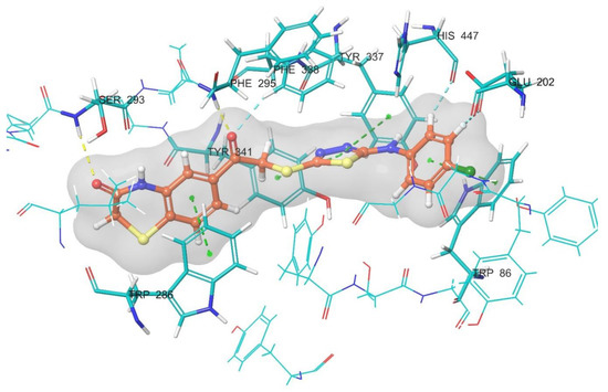 Molecular docking studies were performed to verify the compounds’ inhibition capabilities in silico. For this purpose, the crystal structure of human acetylcholine esterase enzyme (PDB ID: 4EY7) [19] was retrieved from the Protein Data Bank server (www.pdb.org) (accessed on 1 January 2022). The resulting docking poses are presented in Figure 4, Figure 5 and Figure 6.