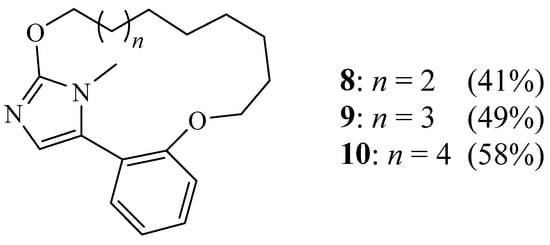 Van Den Berge et al. also used principally the same method to elaborate other 5-aryl-1H-imidazole-containing macrocycles 8–10 by varying the size cavity (Figure 3) [18]. They found that the cyclisation step yield increased with an increase in the chain length. Biological evaluation of the two optically pure enantiomers of one of these molecules enabled them to investigate the influence of chirality on biological activities.