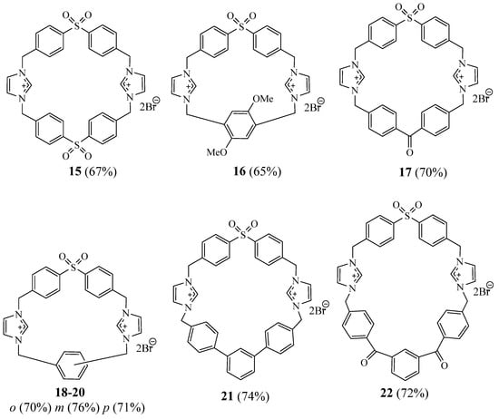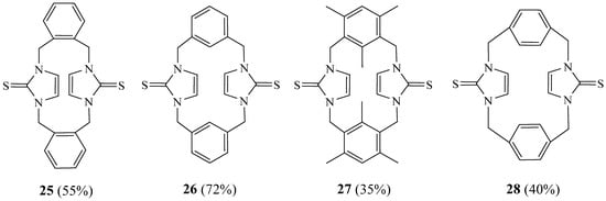 Mageed et al. [22] described the synthesis of new cyclophanes 25–28 (Figure 7) containing two imidazole-2-thione moieties linked by two xylylene groups by the reaction of imidazolium-linked cyclophanes with sulphur in the presence of K2CO3 and using methanol as solvent. Structures of the new cyclophanes were confirmed and investigated by NMR spectroscopy, as well as by X-ray diffraction studies.