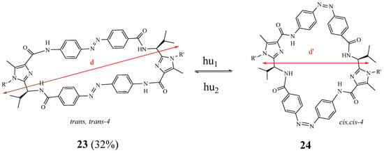 Mehrparvar et al. [21] reported the synthesis and structural investigation of a platform consisting of two imidazole amino acids, which are connected through two azobenzene units 23 and 24 (Figure 6). This platform can be switched by light from the elongated trans, trans-isomer 23 to the compact cis, cis isomer 24, and back.