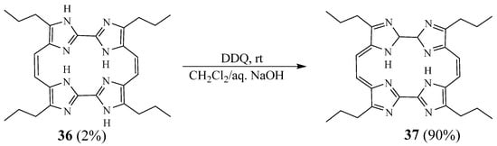 Sargent et al. [26] described the synthesis, spectroscopic properties, and computational analysis of an imidazole-based analogue of porphycene—namely, ‘imidacene’ 37. The reductive coupling of a diformyl-substituted 2,2′-biimidazole using low-valent titanium gives the intermediate macrocycle 36. This step was followed by treatment with 2,3-dichloro-5,6-dicyano-1,4-benzoquinone (DDQ) (Figure 11). This macrocycle was found to undergo rapid decomposition, even in the absence of light and air. Through high-level theoretical calculations, they explained this instability by the presence of a delocalised 18 π–electron pathway in both imidacene and porphycene that provides less aromatic stabilisation energy.