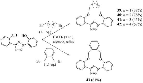 Yu et al. [28] presented the synthesis of a series of novel macrocyclic structures 39–43 incorporating one tetrazole ring by reacting dibromoalkanes with a tetrazole derivative in the presence of alkali metal bases (Figure 13). Through a systematic study, they provided evidence of the effect of the radius alkali cation on the yield of the synthesised macrocycles. They suggested that these macrocyclic tetrazoles should offer a new class of photoactivatable tetrazole reagents for the bioorthogonal tetrazole–alkene cycloaddition reaction in living systems.