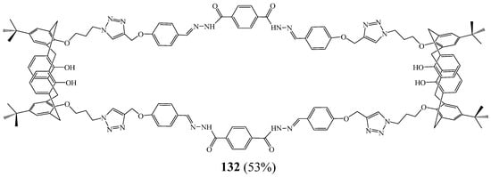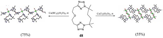 The macrocycle 48 reacts with copper(II) chloride or copper(II) tetrafluoroborate hexahydrate to give complexes [Cu3Cl648] and [Cu48(H2O)2](BF4)2(H2O) [31]. According to single-crystal X-ray analysis, both complexes were found to be coordination polymers (Figure 16).