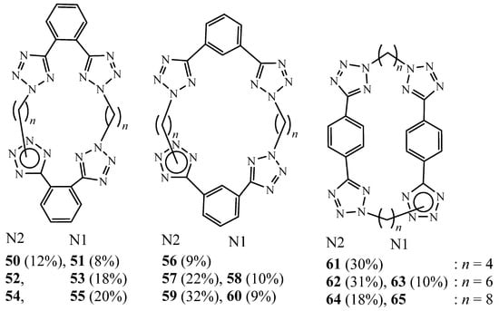 In 2007, Bond et al. described the syntheses of tetra-tetrazole macrocycles, containing two bis-tetrazole units 50–65 linked by a variety of alkyl chain lengths from 4–8 carbons by reacting one equivalent of 1,n-bis(tetrazol-5-yl)benzene and one equivalent of 1,2-, 1,3- or 1,4-[bis(2-(n-bromoalkyl)-tetrazol-5-yl)]benzene in dimethylformamide under nitrogen atmosphere and in the presence of potassium carbonate (Figure 17) [32]. The crystal structures of three of these derivatives were also reported. It was found that the macrocycle conformation is influenced by the length of the alkyl chain linker, the relative orientation of the tetrazole rings on the benzene ring, and by intermolecular interactions.