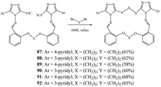 They also reported a simple and efficient method for the preparation of azathia crown macrocycles 87–92 containing two triazole subunits [39]. First, a series of new 1,2/1,3-bis[o-(N-methylidenamino-5-aryl-3-thiol-4H-1,2,4-triazole-4-yl)phenoxy]alkane derivatives were prepared by condensation of 4-amino-5-(aroyl)-4H-1,2,4-triazole-3-thiols or 2-amino-5-mercapto-1,3,4-thiadiazole with bis-aldehydes. Then, the reaction of the obtained compounds with dibromoalkanes allowed obtaining the desired macrocycles (Figure 22). This method does not require high dilution techniques and provides the expected azathia macrocycles in good yields, ranging from 55% to 68%.