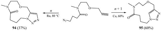 Kelly et al. [44] reported the synthesis of some mono 1,2,3 triazolic macrocycles through a regioselective intramolecular Huisgen cycloaddition, carried out on various azido alkyne substrates. Using catalyst control, a common intermediate was converted to two structurally unique macrocycles with either a 1,5- or a 1,4-triazole resulting in an n (94) or n + 1 (95) ring size by using Ru and Cu as a catalyst, respectively (Figure 24).