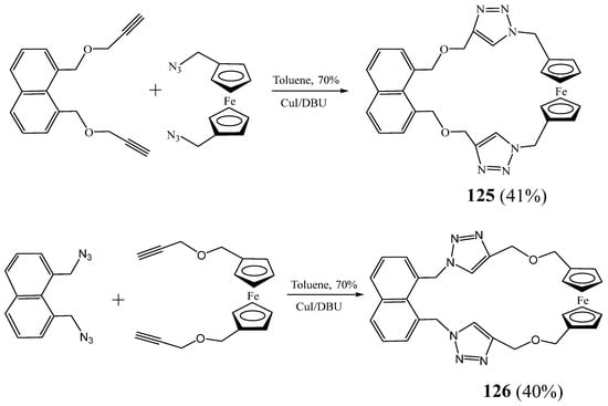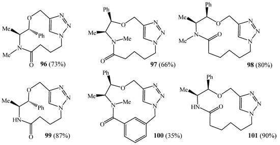 Bogdan et al. [45] generated a series of triazolic macrocycles 96–101 (Figure 25), with drug-like functionality and properties by simple and efficient copper-catalysed azide–acetylene cycloaddition reaction. These macrocycles were obtained in a 5 min reaction without resorting to the high-dilution conditions typical of macrocyclisation reactions, as well as in up to 90% yield.